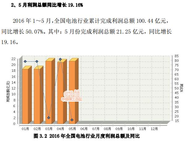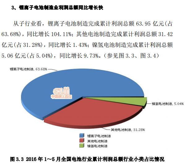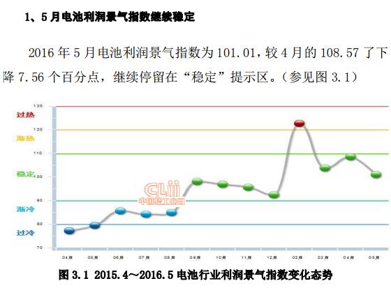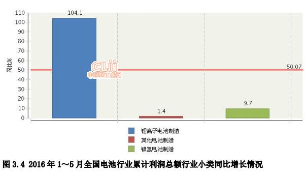 中國(guó)儲(chǔ)能網(wǎng)訊:2016年5月電池利潤(rùn)景氣指數(shù)為101.01,較4月的108.57了下降7.56個(gè)百分點(diǎn),繼續(xù)停留在“穩(wěn)定”提示區(qū)。從子行業(yè)看,鋰離子電池制造完成累計(jì)利潤(rùn)總額63.95億元,同比增長(zhǎng)104.11%;其他電池制造完成累計(jì)利潤(rùn)總額31.42億元,同比增長(zhǎng)1.43%。