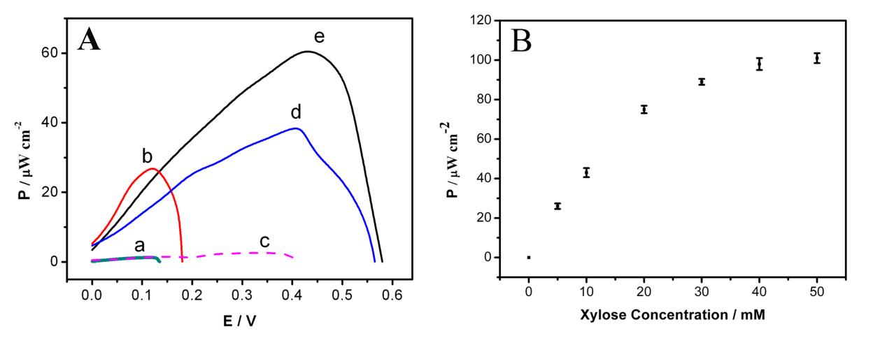 同時(shí),該團(tuán)隊(duì)基于細(xì)菌表面展示的木糖脫氫酶(bacteria-XDH), 通過(guò)優(yōu)化條件,構(gòu)筑了bacteria-XDH /聚亮燦甲酚蘭/多壁碳納米管/玻碳電極 (bacteria-XDH/PBCB/MWNTs/GCE)為生物陽(yáng)極和膽紅素氧化酶修飾的電極為生物陰極的無(wú)隔膜生物燃料電池。該體系開路電位可達(dá)0.58V,最大輸出功率密度為63 μWcm-2(圖1,曲線e),對(duì)比于相同酶活提純的XDH修飾的陽(yáng)極(圖1,曲線d),功率提高60%。該研究將酶的細(xì)菌表面展示技術(shù)應(yīng)用于生物燃料電池,既解決了微生物燃料電池中普遍存在的跨膜電子傳遞與物質(zhì)運(yùn)輸?shù)膯?wèn)題,又解決了酶燃料電池研究中酶的穩(wěn)定性低、成本高的問(wèn)題。(Biosensors & Bioelectronics 2013, 44, 160-163)