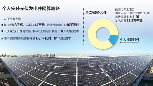 據(jù)國家電網(wǎng)有關負責人介紹,自2012年10月26日《關于做好分布式光伏發(fā)電并網(wǎng)服務工作的意見》發(fā)布后,截至2月底,電網(wǎng)公司已累計受理分布式光伏報裝業(yè)務119件,發(fā)電容量一共33.8萬千瓦,但其中個人報裝僅14件。
