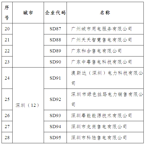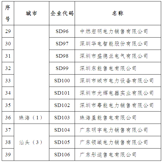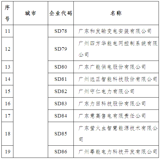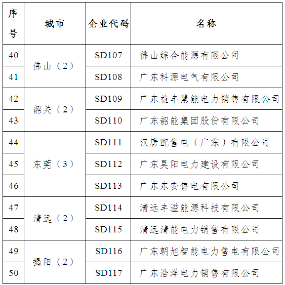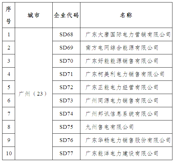 這些企業(yè)有,廣東大唐國(guó)際電力營(yíng)銷有限公司、南方電網(wǎng)綜合能源有限公司、廣東好能能源銷售有限公司、廣東柯美利電力銷售有限公司、廣東正能電力經(jīng)營(yíng)有限公司、廣州同源電力銷售有限公司、廣州邦訊信息系統(tǒng)有限公司、九州售電有限公司、廣東華暢電力銷售股份有限公司、廣東能洋電力建設(shè)有限公司、廣東和發(fā)輸變電安裝有限公司等50家。