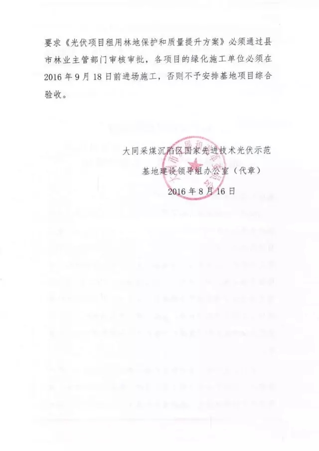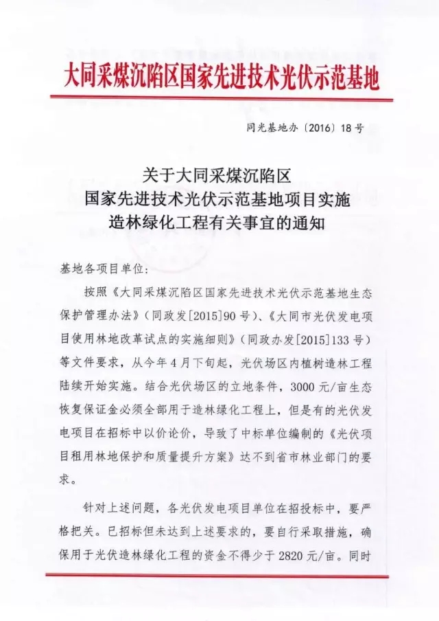 關于大同采煤沉陷區(qū)國家先進技術光伏示范基地項目實施造林綠化工程有關事宜的通知