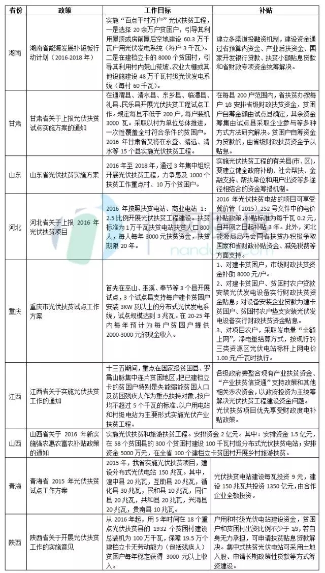 2016年3月23日,國家五部委發(fā)布五部委《關(guān)于實施光伏發(fā)電扶貧工作的意見》,意見指出,要在2020年之前,重點在前期開展試點的、光照條件好的16個省的471個縣的約3.5萬個建檔立卡貧困村,以整村推進的方式 ,保障200萬建檔立卡無勞動能力貧困戶(包括殘疾人)每年每戶增加收入3000元以上。其他光照條件好的貧困地區(qū)可按照精準(zhǔn)扶貧的要求可因地制宜推進實施。