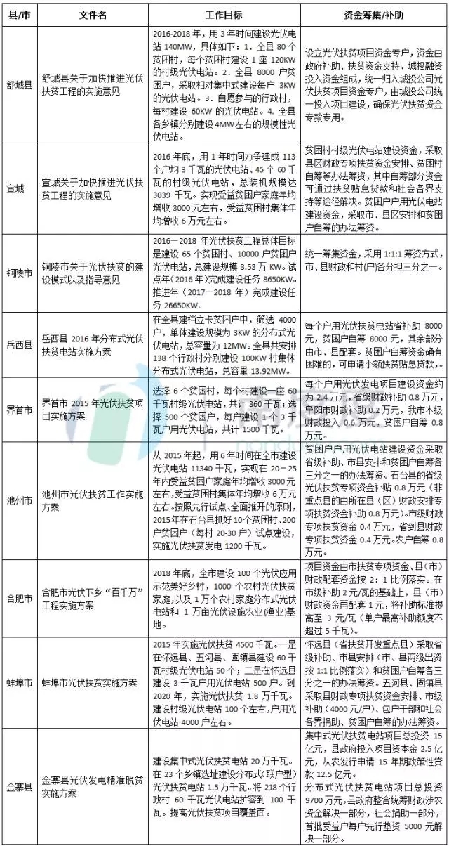 不同于省級的政策制定的是一個宏觀的目標(biāo)計劃,縣級的相關(guān)政策則更具有落地性和實操性。其中,安徽省在光伏扶貧中表現(xiàn)得最為積極。
