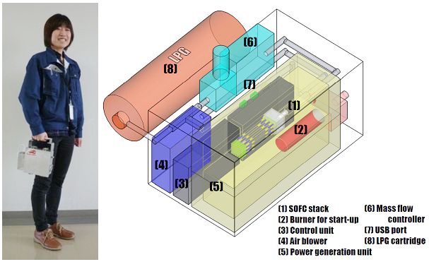 AIST研究所在先進陶瓷反應堆項目(FY2005 - 2009)支持下開發(fā)出了一種微型SOFC系統(tǒng),內(nèi)部通過甲烷重整制氫,在納米結(jié)構(gòu)的電極催化層上添加了二氧化鈰,運行溫度為450 ºC,可在數(shù)分鐘內(nèi)啟動。該便攜式FC系統(tǒng)參加了今年東京的第十二屆納米技術(shù)展覽,展示了這種在緊急情況下可以為小型電子設備供能的燃料電池系統(tǒng)。