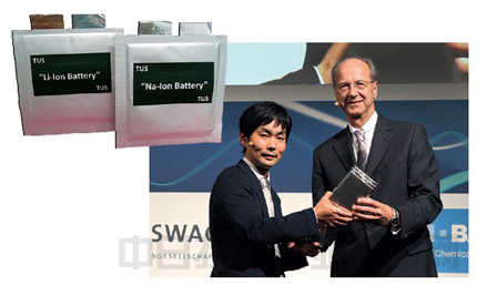 東京理科大學試制的鈉離子電池(左)與在德國領(lǐng)獎的藪內(nèi)直明(右側(cè)照片左側(cè))