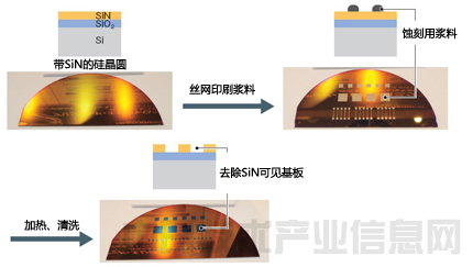 在蝕刻工序中,首先利用絲網(wǎng)印刷工藝在想蝕刻的部位印刷漿料。然后在170℃下加熱5分鐘,這時(shí)漿料就會(huì)產(chǎn)生去除SiN的“蝕刻劑”,對漿料下面的SiN進(jìn)行蝕刻。