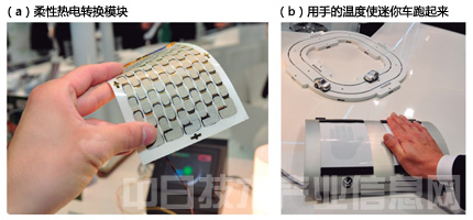 富士膠片開發(fā)出了采用有機(jī)高分子材料的熱電轉(zhuǎn)換模塊(a)。在會(huì)場,用手的溫度驅(qū)動(dòng)了迷你車(b)。計(jì)劃設(shè)置于太陽能電池模塊的背面使用。
