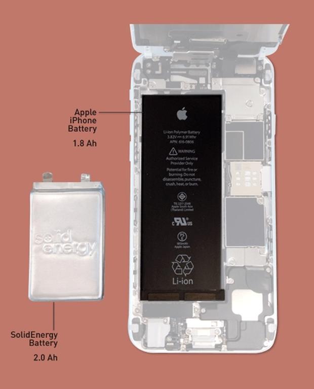 iPhone 6目前使用的就是鋰離子電池,可提供電量為1.8安培小時。而SolidEnergy電池的體積只有前者的一半,電量卻高達(dá)2.0安培小時。