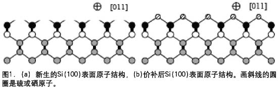 “價(jià)補(bǔ)(valence mending)”的概念是Kaxiras提出的,旨在解除半導(dǎo)體表面的懸空鍵。對(duì)于Si(100)表面,價(jià)補(bǔ)是用硫或硒的單原子層實(shí)現(xiàn)的。在新生Si(100)表面,每一表面原子占據(jù)二個(gè)懸空鍵,如圖1(a)所示。這些懸空鍵是表面態(tài)的起源,它們釘扎表面費(fèi)米能級(jí)。在金屬/Si界面,費(fèi)米能級(jí)釘扎效應(yīng)使肖特基勢(shì)壘高度與金屬功函數(shù)沒什么關(guān)系,主要受表面態(tài)(或更恰當(dāng)?shù)卣f是界面態(tài))的控制。硫或硒的單原子層淀積在Si(100)表面時(shí),它們?cè)诙€(gè)Si原子間橋接,很好地中止了Si(100)上的懸空鍵,如圖1(b)所示。我們已有論文報(bào)道過硫或硒用于Si(100)表面的價(jià)補(bǔ)鈍化,然而,對(duì)于萬億瓦級(jí)光伏應(yīng)用,硫比硒豐富得多。