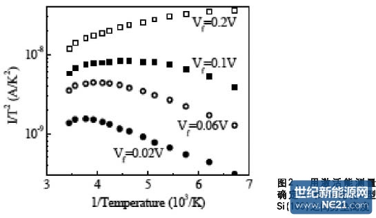 實(shí)驗(yàn)是在低劑量1015cm-3Sb摻雜n型Si(100)硅片上進(jìn)行的。鈍化后,在硅片上用電子束蒸發(fā)和剝離(lift-off)工藝制作直徑200μm的Al圓點(diǎn)。重要的是,鈍化后的濺射工藝要緩和,因?yàn)闉R射淀積能破壞鈍化層。圖2說明確定Se鈍化n型Si(100)上Al勢(shì)壘高度的激活能測(cè)量,以及斜率給出的勢(shì)壘高度。取決于偏壓,勢(shì)壘高度在0.06-0.10eV間變化,遠(yuǎn)遠(yuǎn)低于Al/n型Si接觸長(zhǎng)期建立的值0.72eV。