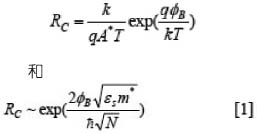 創(chuàng)紀(jì)錄低的勢(shì)壘高度應(yīng)導(dǎo)致Al和n型Si間極低的接觸電阻。輕摻雜與重?fù)诫sSi的接觸電阻分別由下面二式給出: