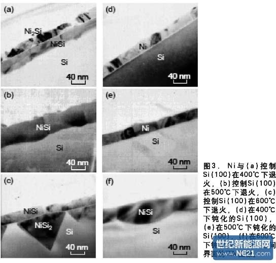 實(shí)驗(yàn)是通過檢驗(yàn)在Se鈍化Si(100)表面上Ni硅化進(jìn)行的。在二片Si(100)硅片上淀積50nm Ni膜,一片有Se鈍化,另一片沒有Se鈍化。在N2中400-700℃間加熱這些樣品60秒 進(jìn)行硅化,用透射電子顯微鏡檢查Ni/Si界面。結(jié)果示于圖3。對(duì)于沒有Se且在400℃下退火的控制樣品,觀察到硅化,結(jié)果在Ni和Si間有二層硅化物堆疊(圖3(a))。這證實(shí)了Foll等人早先對(duì)于Ni硅化的TEM研究。他們的結(jié)論是,二層堆疊分別為Ni2Si和NiSi。500℃退火后,單層NiSi出現(xiàn)在控制樣品的Ni/Si界面(圖3(b))。但是,鈍化樣品的表現(xiàn)完全不同。400℃退火后(圖3(d)),Ni與Se鈍化Si(100)表面間沒有硅化而且界面陡削。500℃退火后,Ni與Se鈍化Si(100)表面間仍然沒有明顯的反應(yīng)(圖3(e))。僅僅在600℃退火后,Ni與Se鈍化Si(100)反應(yīng)形成單層NiSi(圖3(f))。因此,Ni/Se鈍化Si(100)界面的熱穩(wěn)定性是~400℃。