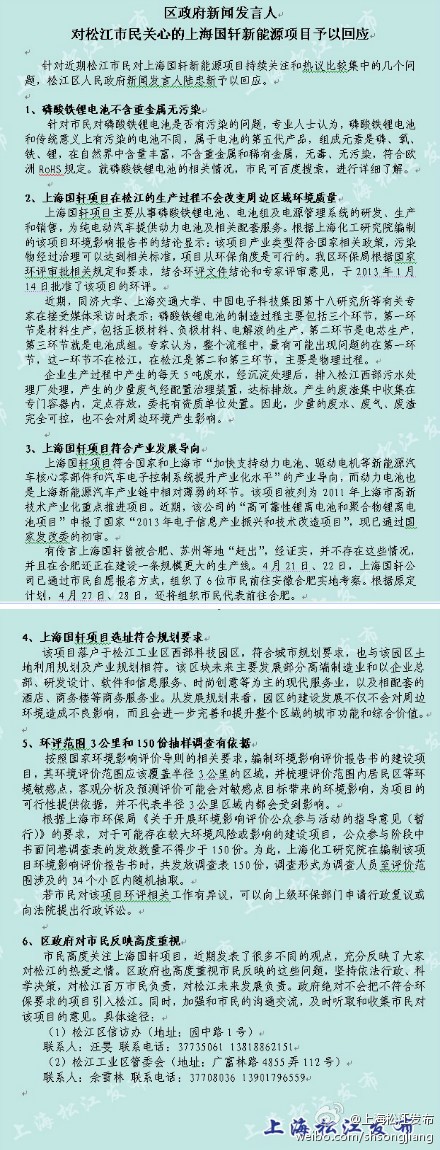 針對網(wǎng)上傳言上海國軒新能源項目曾被合肥、蘇州等地“趕出”,經(jīng)查實,不存在這種情況,目前合肥還正在建設(shè)一條規(guī)模更大的生產(chǎn)線。4月21日、22日,上海國軒公司通過市民自愿報名的方式,組織了6位市民前往合肥實地考察。根據(jù)計劃,明天(4月27日)、后天(4月28日)還將組織市民代表前往。