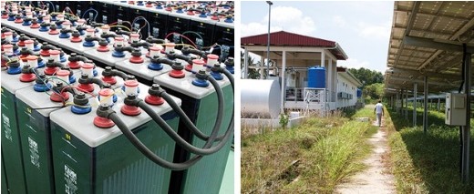 在丹戎巴都勞勿鎮(zhèn)附近,一大排太陽能板(右圖)把電儲(chǔ)存到建筑內(nèi)部的一列鉛酸蓄電池(左圖)中。柴油發(fā)電機(jī)坐落在平臺(tái)上,和太陽能板以及蓄電池一起組成了微電網(wǎng)電站。