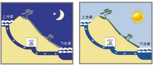午夜,用電量低時,發(fā)電機停止發(fā)電,泵將水從下水庫抽到上水庫中,將剩余能量轉換為重力勢能儲存。白天,當用電量激增時,上水庫放水,水借助地勢差沖向下水庫,推動發(fā)電機組發(fā)電,供給電網。