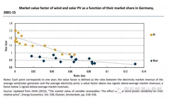 從德國的實例來看,隨著風(fēng)電光伏占發(fā)電量比例的增加,由于其間歇性為電網(wǎng)帶來的成本增加,其系統(tǒng)價值在下降,尤其是光伏SV下降幅度更大。