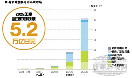 繼2011年度之后,以產(chǎn)業(yè)和商業(yè)用途及家庭用途領域為中心,燃料電池系統(tǒng)市場在2012年度以后也將繼續(xù)擴大。預計到2015年度將達到3,388億日元。如果燃料電池車在2015年度開始全面銷售,則該市場的增長將進一步加速。燃料電池車用途市場在2011年度僅為3億日元,而到2025年度,將擴大到29,106億日元,占整體市場的一半以上。