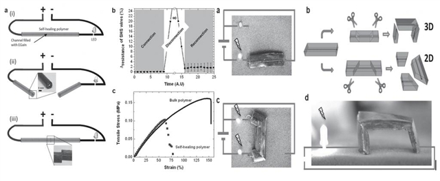 這種新型彈性導(dǎo)線的自我修復(fù)功能主要體現(xiàn)在當(dāng)導(dǎo)線被切斷時(shí),液態(tài)金屬會(huì)迅速發(fā)生氧化,形成一層致密的氧化物皮膚,防止液態(tài)金屬從護(hù)套中滲出或者退卻進(jìn)入護(hù)套而是保持合金與微流體通道同高。即使是過了幾十分鐘,一旦將切斷處重新相連,液態(tài)金屬也能自動(dòng)重連,從而接通電路,逐漸修復(fù)切斷的地方。此外在對導(dǎo)線進(jìn)行拉伸性能測試時(shí),由于通道中為液態(tài)金屬材料,流動(dòng)性很強(qiáng),在進(jìn)行拉伸時(shí)也不影響其導(dǎo)電性能,只是切斷后導(dǎo)線的拉伸性能有所下降。