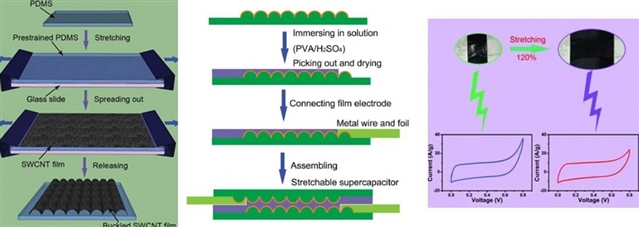 來自新加坡南洋理工大學(xué)的研究人員巧妙地利用卷曲的具有網(wǎng)狀結(jié)構(gòu)的單壁碳納米管(buckled Single-Walled Carbon Nanotube)膜結(jié)合具有優(yōu)異力學(xué)性能的H2SO4-PVA膠作為電解質(zhì)和隔膜,成功研制出具有超強(qiáng)伸縮性、高集成度的超級(jí)電容器(Supercapacitors)的儲(chǔ)能裝置,用于彌補(bǔ)彈性電子產(chǎn)品急需的能量來源。該研究工作發(fā)表在Advanced Materials上。