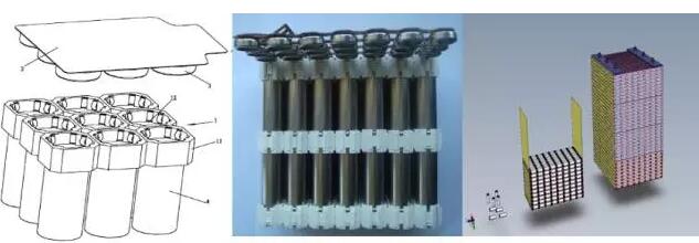 電動(dòng)汽車儲(chǔ)能系統(tǒng)有關(guān)單體電芯容量選型的“大”“小”之爭(zhēng),按中科院陳立泉院士的話說就是電動(dòng)汽車發(fā)展路線之爭(zhēng)。目前,由于電池管理技術(shù)的限制等多種因素,國(guó)內(nèi)電動(dòng)汽車的儲(chǔ)能系統(tǒng)多采用大容量方形電池,而與Tesla類似采用小容量單體電芯組裝電動(dòng)汽車儲(chǔ)能系統(tǒng)的并不多,其中就包括杭州賽恩斯。該公司來自哈爾濱理工的李革臣教授提出了一個(gè)新名詞“本征安全性”,在電池行業(yè)內(nèi)獲得了部分專家認(rèn)同,即滿足兩個(gè)條件:一是最小容量電芯,其能量限制為單獨(dú)使用或存放時(shí)若發(fā)生燃燒或爆炸不足以產(chǎn)生嚴(yán)重后果;二是在電池模塊中,一個(gè)最小容量電芯若發(fā)生燃燒或爆炸,不會(huì)引起其他電芯連鎖燃燒或爆炸。考慮到當(dāng)前鋰離子電池的安全性水平,杭州賽恩斯也采用小容量圓柱形鋰離子電芯,并采用模塊化并聯(lián)和串聯(lián)連接方式裝配電池組(可參考CN 101369649),其電池連接裝置及組裝示意圖如圖3所示。