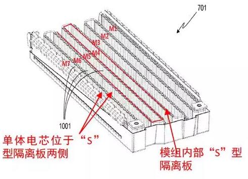電池模組(如圖6所示)其內(nèi)部被“S”型隔離板劃分為7個(gè)區(qū)域(圖6中M1-M7區(qū)域),“S”型隔離板內(nèi)部為電池模組的冷卻通道,并與電池包的熱管理系統(tǒng)相連接。