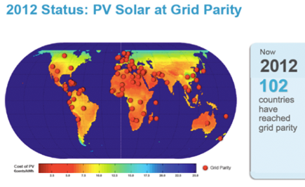 中國儲(chǔ)能網(wǎng)訊:尚德電力的首席技術(shù)官Stuart Wenham教授在近日舉辦的2013墨爾本太陽能會(huì)議的演講上公布了一幅有意思的地圖,顯示了目前太陽能光伏電站發(fā)電已經(jīng)可以實(shí)現(xiàn)平價(jià)上網(wǎng)的102個(gè)國家和地區(qū)。
