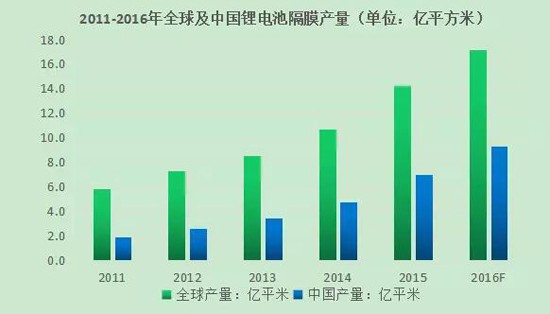 中國(guó)儲(chǔ)能網(wǎng)訊:受鋰電池市場(chǎng)快速發(fā)展影響,全球鋰電池隔膜市場(chǎng)快速增長(zhǎng),2015年,全球鋰電池隔膜產(chǎn)量約為14.2億平方米,較上年同比增長(zhǎng)33.1%。受國(guó)內(nèi)新能源汽車市場(chǎng)繼續(xù)爆發(fā),動(dòng)力鋰電池出貨激增影響,2015年中國(guó)鋰電池隔膜市場(chǎng)也取得快速發(fā)展。據(jù)調(diào)研數(shù)據(jù)顯示,2015年中國(guó)鋰離子電池隔膜企業(yè)產(chǎn)量為6.98億平方米,同比增長(zhǎng)48.89%;2015年中國(guó)鋰電池隔膜產(chǎn)值26.53億元,同比增長(zhǎng)57.67%。2016年上半年,全球鋰電池隔膜產(chǎn)量為7.9億平米,同比增長(zhǎng)20.8%;中國(guó)鋰電池隔膜產(chǎn)量為4.0億平米,同比增長(zhǎng)31.6%。
