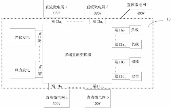 1.一種基于多端口直流變電站的直流微電網(wǎng)系統(tǒng),其特征在于:該系統(tǒng)包括區(qū)域型直流微電網(wǎng)模塊以及多個直流微電網(wǎng)單元1-n,該區(qū)域型直流微電網(wǎng)模塊由分布式能源發(fā)電、儲能、負(fù)載通過多端口直流變電站組成,多個直流微電網(wǎng)單元1-n通過該區(qū)域型直流微電網(wǎng)模塊的多端口直流變電站實(shí)現(xiàn)互聯(lián)。