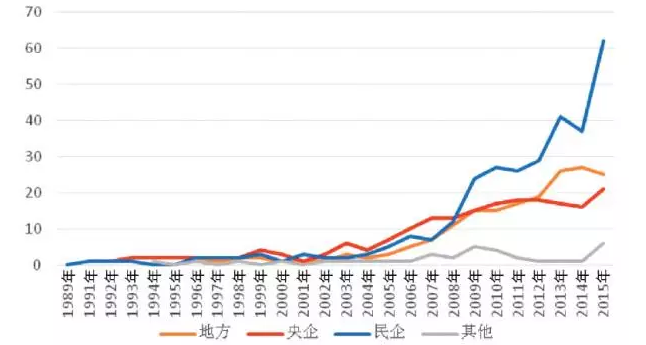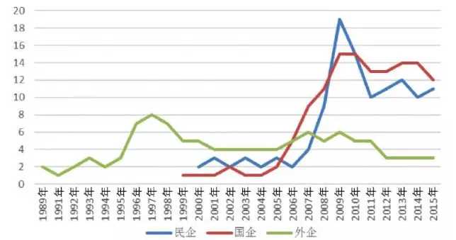 風(fēng)電開發(fā)企業(yè)主要為中國(guó)企業(yè),外商投資企業(yè)進(jìn)入中國(guó)市場(chǎng)非常有限。在國(guó)企中,主要分布有中央直屬企業(yè)和地方國(guó)企。從風(fēng)電開發(fā)企業(yè)數(shù)量變化看,2004年以前,不足10家企業(yè),從2005年起逐年增長(zhǎng),到2013年超過80家,其中央企17家,地方國(guó)企26家,民企41家(國(guó)企和民企均超過40家,在此期間,國(guó)企的數(shù)量一直比民企多);到2015年,企業(yè)數(shù)量共計(jì)超過100家企業(yè),民企數(shù)量突破60家,超過國(guó)企,央企和地方國(guó)企數(shù)量與2013年相比變化不大。