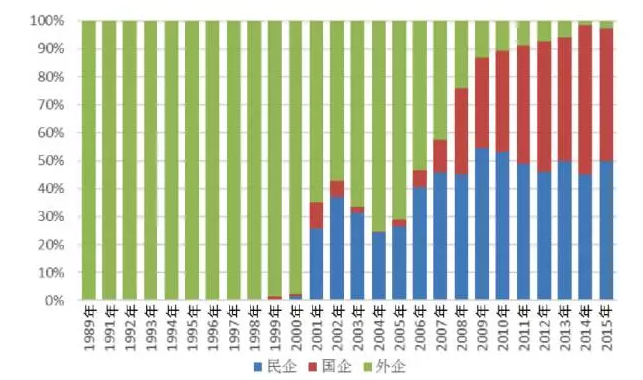 從風(fēng)電制造企業(yè)歷年新增裝機(jī)容量看,2000年之前,外企獨(dú)占整個(gè)中國(guó)風(fēng)電市場(chǎng)。2001年起中國(guó)風(fēng)電市場(chǎng)格局發(fā)生改變,中國(guó)企業(yè)勢(shì)力開始增強(qiáng),市場(chǎng)占有率達(dá)到35.4%(民企25.9%,國(guó)企9.5%),外企下降到64.6%。但2003年至2004年,中國(guó)企業(yè)出現(xiàn)萎縮,2004年占有率下降到不足25%,且?guī)缀跞縼碜悦衿?,而外企市?chǎng)占有率達(dá)到75%。2005年,隨著中國(guó)企業(yè)數(shù)量的增加,市場(chǎng)占有率也在逐年攀升,尤其國(guó)企增長(zhǎng)明顯,從圖2可以看出,外企的市場(chǎng)份額逐漸被國(guó)企吞噬。2014年中國(guó)企業(yè)市場(chǎng)占有率達(dá)到歷史高點(diǎn)98.3%(民企45.3%,國(guó)企53%),外企1.7%。