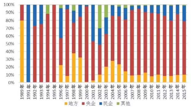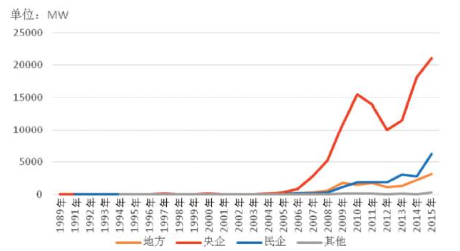 從歷年新增裝機(jī)的市場(chǎng)占有率看,從2005年到2015年,國(guó)企的市場(chǎng)占有率均超過80%,在2008年最高達(dá)到95%,之后又回落在80%至90%之間,其中,央企的市場(chǎng)占有率達(dá)到70%至80%之間,而地方國(guó)企僅占10%左右。從2009年至2015年,民企市場(chǎng)占有率整體趨勢(shì)顯示增強(qiáng),尤其在2013年和2014年,民企市場(chǎng)占有率達(dá)到20%左右。