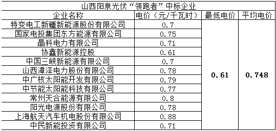 表五山西陽泉光伏領(lǐng)跑者中標(biāo)企業(yè)及電價