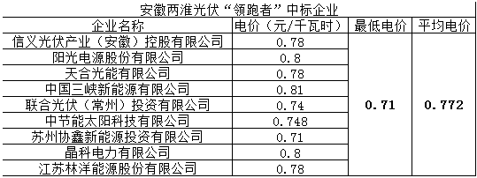 表四安徽兩淮光伏領(lǐng)跑者中標(biāo)企業(yè)及電價