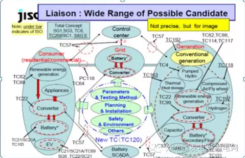 IECTC120:由于IEC/TC120成立較晚,其工作范圍包含儲能載體及裝備技術(shù)、儲能系統(tǒng)集成技術(shù)、儲能系統(tǒng)接入(并網(wǎng))與控制技術(shù)以及儲能應用技術(shù)等,跨際多個學科領域。因此,TC120與IEC其他工作組關系相對復雜,在制定標準體系方面困難較大。目前,IECTC120已經(jīng)成立5個工作組:術(shù)語、單位參數(shù)和測試方法、規(guī)劃和安裝、環(huán)境問題、安全事項,力圖規(guī)劃其標準體系。