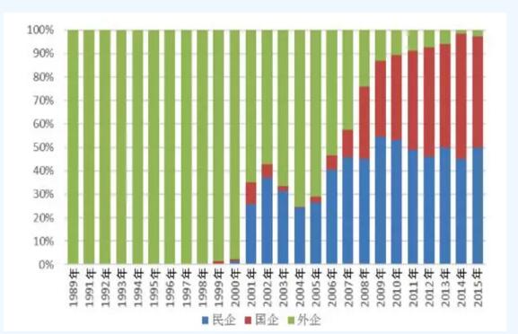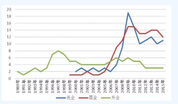 中國風電整機制造企業(yè)累計共有73家,外企21家,民企26家,國企20家,這些企業(yè)在風電發(fā)展的三十年間陸陸續(xù)續(xù)有進有退,直到2015年,外企3家,國企12家,民企11家。從風電制造企業(yè)個數(shù)變化看,上世紀九十年代,外資企業(yè)獨占中國市場,起初只有2家至3家進入中國市場,1997年達到最多,出現(xiàn)8家,隨后又減少到5家左右;隨著風電技術的引進,中國制造企業(yè)起步于本世紀初,2000年還不到五家,2005年起開始增長,2009年達到最多,當年企業(yè)數(shù)量為34家(民企19家,國企15家),2011年又一度減退到23家(民企10家,國企13家)?!笆濉逼陂g,無論是外資企業(yè)還是中國企業(yè),較之前都有明顯的減少,近兩年維持穩(wěn)定在25家左右。