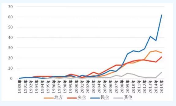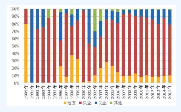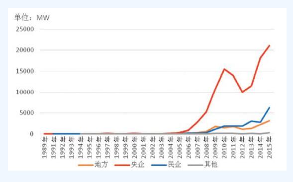 從歷年新增裝機的市場占有率看,從2005年到2015年,國企的市場占有率均超過80%,在2008年最高達到95%,之后又回落在80%至90%之間,其中,央企的市場占有率達到70%至80%之間,而地方國企僅占10%左右。從2009年至2015年,民企市場占有率整體趨勢顯示增強,尤其在2013年和2014年,民企市場占有率達到20%左右。