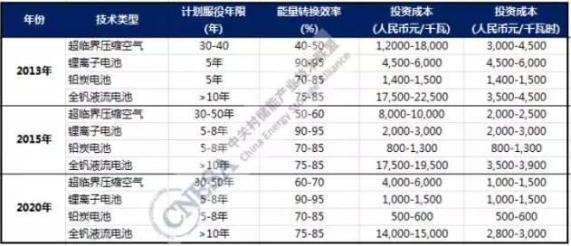 注:鋰離子電池為1小時(shí)磷酸鐵鋰電池系統(tǒng);鉛炭電池為1小時(shí)系統(tǒng);全釩液流電池為5小時(shí)系統(tǒng);超臨界壓縮空氣為4小時(shí)系統(tǒng)。此處投資成本為系統(tǒng)成本,含電池管理系統(tǒng)。
