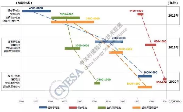 通過(guò)中關(guān)村儲(chǔ)能產(chǎn)業(yè)技術(shù)聯(lián)盟(CNESA)2015年和2016年上半年對(duì)主流儲(chǔ)能技術(shù)成本的統(tǒng)計(jì)和分析,儲(chǔ)能的投資成本與2013年相比有大幅下降,鋰離子電池(以磷酸鐵鋰為例)的系統(tǒng)成本最低值已經(jīng)降低到300美元/kWh,預(yù)計(jì)到2020年,還將下降50%,最低達(dá)到150美元/kWh(按2016年9月兌換率計(jì)算)。到2020年,其他技術(shù)的投資成本也有很大下降空間,其中鉛蓄電池將下降48%,全釩液流電池將下降23%,超臨界壓縮空氣將下降44%。