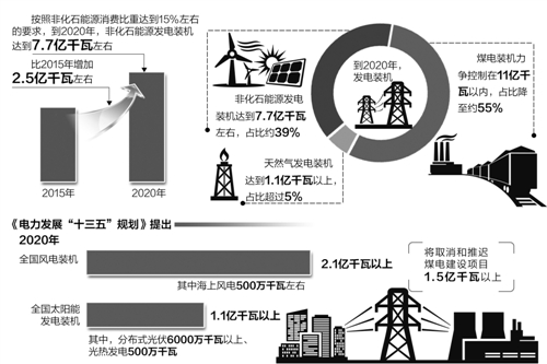 在電源結構方面。按照非化石能源消費比重達到15%左右的要求,到2020年,非化石能源發(fā)電裝機達到7.7億千瓦左右,比2015年增加2.5億千瓦左右,占比約39%,提高4個百分點,發(fā)電量占比提高到31%;天然氣發(fā)電裝機增加5000萬千瓦,達到1.1億千瓦以上,占比超過5%;煤電裝機力爭控制在11億千瓦以內,占比降至約55%。電源結構得到進一步優(yōu)化。