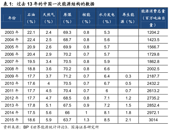 全球最為權(quán)威的能源消費(fèi)數(shù)據(jù)是 BP 公司的《世界能源統(tǒng)計(jì)評(píng)論》,我們根據(jù)最 新的數(shù)據(jù),更新了過(guò)去 13 年的中國(guó)一次能源結(jié)構(gòu)的數(shù)據(jù),從表格中我們可以看到的數(shù)據(jù)顯示: