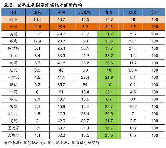 新能源相對(duì)于傳統(tǒng)能源來(lái)說(shuō),主要的特征在于能量轉(zhuǎn)換和使用過(guò)程中是否有碳 元素的參與。就美國(guó)這種成熟國(guó)家來(lái)看,電的消耗只占能源消費(fèi)總量的 1/5 左右。 并不是不用電,而是能源利用的方式應(yīng)該是使用目的相匹配,在家里可以用電加 熱,但是在工廠里一般的熱源采用化石燃料供熱的可能性就更高。在目前的發(fā)達(dá) 經(jīng)濟(jì)體中,美國(guó)的能源新能源新消費(fèi)模式最為具有代表性,發(fā)達(dá)國(guó)家中的美國(guó), 日本,韓國(guó),法國(guó),德國(guó),英國(guó),意大利,西班牙等,電力消費(fèi)的占比上限基本 維持在 20-25%左右。無(wú)法突破這個(gè)比例上限的主要原因是技術(shù)原因,否則像法 國(guó)這種核電占比非常高的國(guó)家里,大家都應(yīng)該用電力,而非用化石能源。