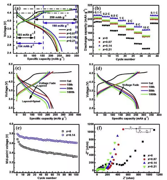 哈爾濱工業(yè)大學(xué)的Quanxin Ma等人針對(duì)富鋰材料這些問題進(jìn)行了摻雜改性實(shí)驗(yàn)。Quanxin Ma通過向富鋰材料中加入Se元素合成了Li1.2[Mn0.7Ni0.2Co0.1]0.8_xSexO2,實(shí)驗(yàn)表明該材料具有良好的倍率性能,在10C的倍率下,比容量可達(dá)178mAh/g,并且Se元素?fù)诫s很好的抑制了富鋰材料的電壓衰降,循環(huán)100次,中值電壓衰降僅為5%。