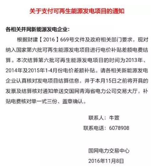 中國儲能網(wǎng)訊:11月8日,國家電力交易中心向青海新能源企業(yè)下發(fā)的《關(guān)于支付可再生能源發(fā)電項目的通知》(下稱“通知”)明確,計劃對納入國家第六批可再生能源發(fā)電項目進(jìn)行電價補(bǔ)貼差額電費結(jié)算。同時《通知》要求,相關(guān)新能源企業(yè)在11月15日前將開具的發(fā)票及結(jié)算核對通知單送交青海國網(wǎng)交易大廳。