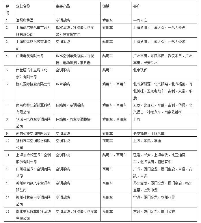目前新能源汽車用空調市場仍延續(xù)傳統(tǒng)汽車空調市場格局,整車與空調企業(yè)供應關系變化不大。