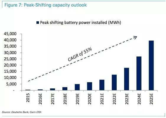 中國儲能網(wǎng)訊:根據(jù)德意志銀行最新發(fā)布的一份研究報告的分析,全球電池儲能正處于爆發(fā)的關(guān)鍵點。2015年的電池儲能量為70 GWh(7000萬千瓦時),到2018年將飆升至210GWh(2.1億千瓦時),而到2025年將進一步達到535GWh(5.35億千瓦時)。