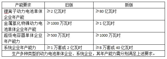 第二,產(chǎn)能要求極其大幅提高。新版規(guī)定,鋰離子動力電池單體企業(yè)年產(chǎn)能力不低于80億瓦時,金屬氫化物鎳動力電池單體企業(yè)年產(chǎn)能力不低于1億瓦時,超級電容器單體企業(yè)年產(chǎn)能力不低于1千萬瓦時。系統(tǒng)企業(yè)年產(chǎn)能力不低于80000套或40億瓦時。生產(chǎn)多種類型的動力電池單體企業(yè)、系統(tǒng)企業(yè),其年產(chǎn)能力需分別滿足上述要求。