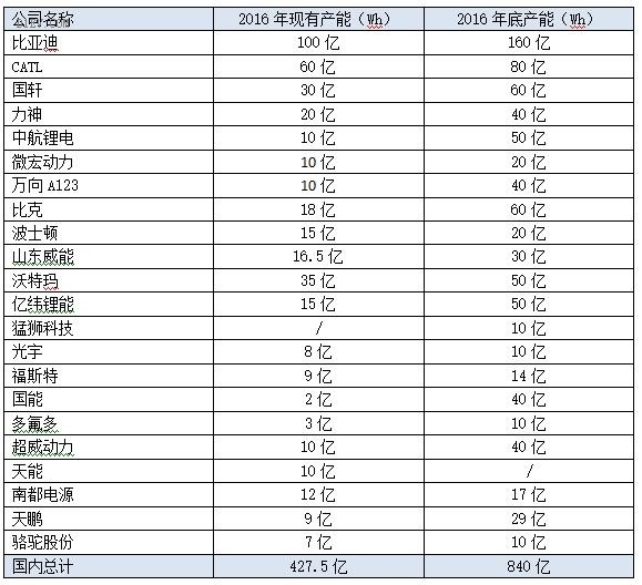 表2 國內(nèi)主流動力電池企業(yè)產(chǎn)能情況