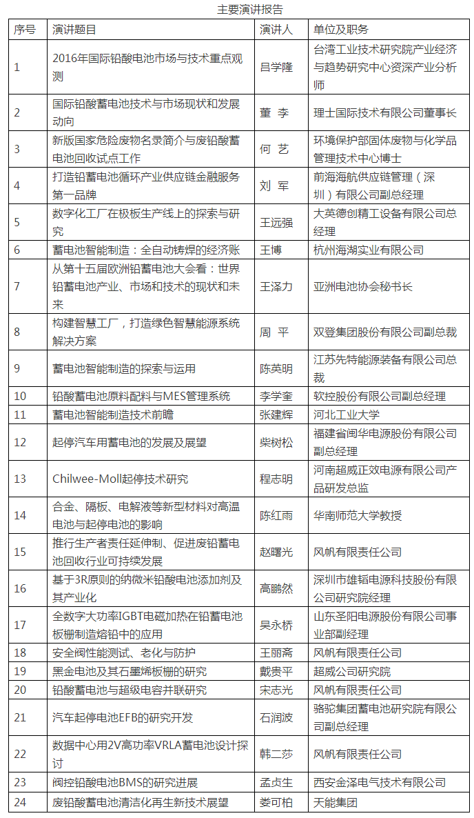 中國(guó)化學(xué)與物理電源行業(yè)協(xié)會(huì)于12月15-16日在西安舉辦的“2016年中國(guó)國(guó)際鉛酸蓄電池高峰論壇”,邀請(qǐng)了24位專家與大家分享在鉛酸蓄電池市場(chǎng)與新技術(shù)進(jìn)展、自動(dòng)化改造和智能制造、回收再生利用等多個(gè)領(lǐng)域的最新進(jìn)展和應(yīng)對(duì)之策。