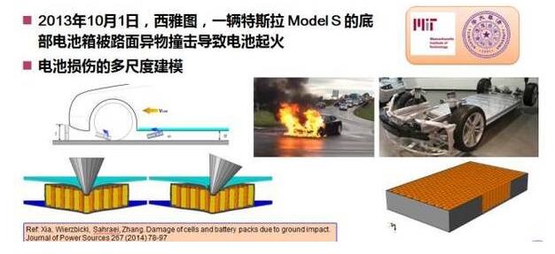 這是我們幾年前做的研究(圖2),是在整車層面上,當(dāng)時(shí)夏勇老師在MIT訪問(wèn)一年,2013年10月1號(hào)著名的特斯拉Model S事故,把底板打穿了,一組電池著火了,夏勇老師做了從汽車底部沖擊電池的建模和仿真,這是兩年前發(fā)表的,當(dāng)時(shí)的模型還不是很準(zhǔn)確,現(xiàn)在我們從材料層面做得很細(xì),相信再過(guò)幾年一定會(huì)有一個(gè)很好的能夠預(yù)測(cè)的模型。