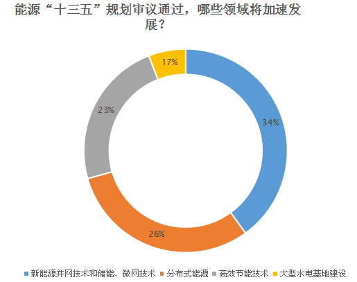 在“十三五”期間,可再生能源是否還能保持如此良好的發(fā)展勢(shì)頭?哪些領(lǐng)域?qū)⒓铀侔l(fā)展?中國電力新聞網(wǎng)以及中電傳媒微博、微信、論壇發(fā)起關(guān)于“能源“十三五”規(guī)劃審議通過,哪些領(lǐng)域?qū)⒓铀侔l(fā)展?”的話題征集活動(dòng),調(diào)查數(shù)據(jù)顯示,34%的網(wǎng)友認(rèn)為,新能源并網(wǎng)技術(shù)和儲(chǔ)能、微網(wǎng)技術(shù)在十三五期間將得到迅速發(fā)展;26%的網(wǎng)友認(rèn)為,分布式能源在“十三五”期間也將迎來機(jī)遇;除此之外,20%的網(wǎng)友認(rèn)為,高效節(jié)能技術(shù)將成為“十三五”期間能源發(fā)展的重點(diǎn);還有5%的網(wǎng)友認(rèn)為,大型水電基地建設(shè)在“十三五”期間將成為能源領(lǐng)域建設(shè)重點(diǎn)。